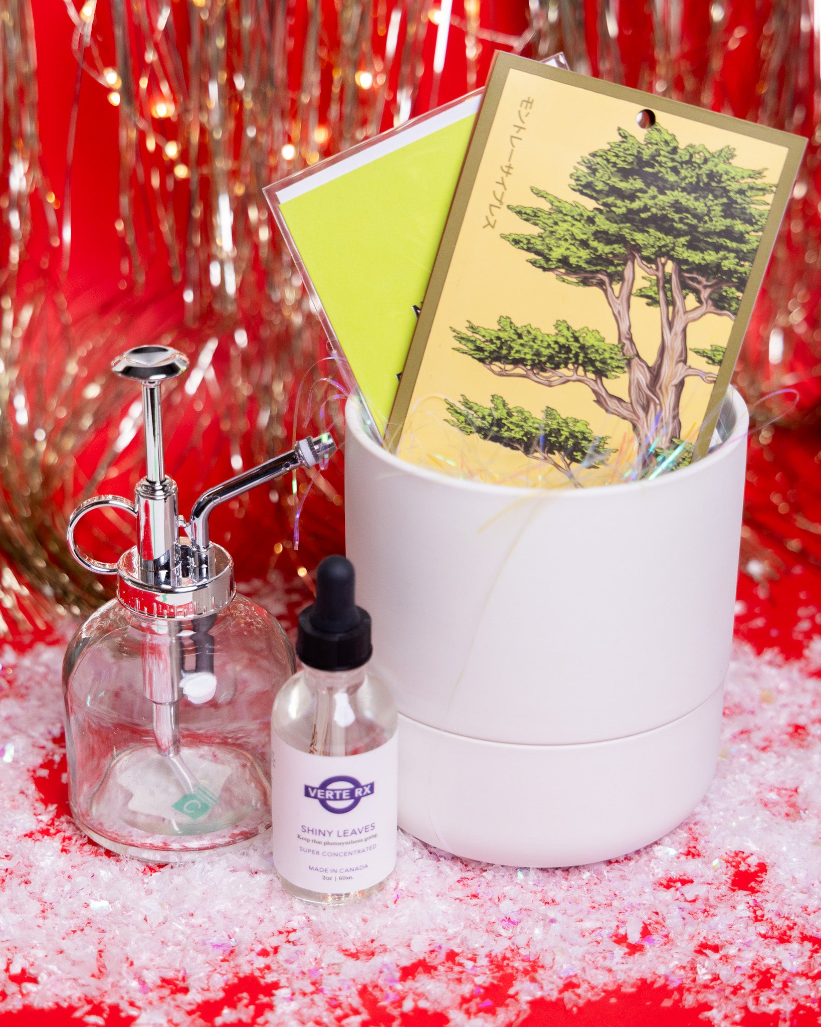 Eight pieces of horticultural luxury including the Ryan self-watering pot, because we've evolved beyond remembering to water things like cavemen. Five mystery indoor plant seeds (surprise! They're all equally demanding!), Verte RX Shiny Leaves to keep those leaves so clean you could perform surgery on them, and a colorful mister because plain water isn't good enough anymore. The greeting card thoughtfully acknowledges that you're enabling their problem. This is for the person who monitors their plants' humidity levels more closely than their own cholesterol, who has strong opinions about perlite ratios, and who genuinely gets excited about new aerial roots. The self-watering pot is the real hero here, finally allowing them to take a weekend trip without arranging plant visitation rights with the neighbors.