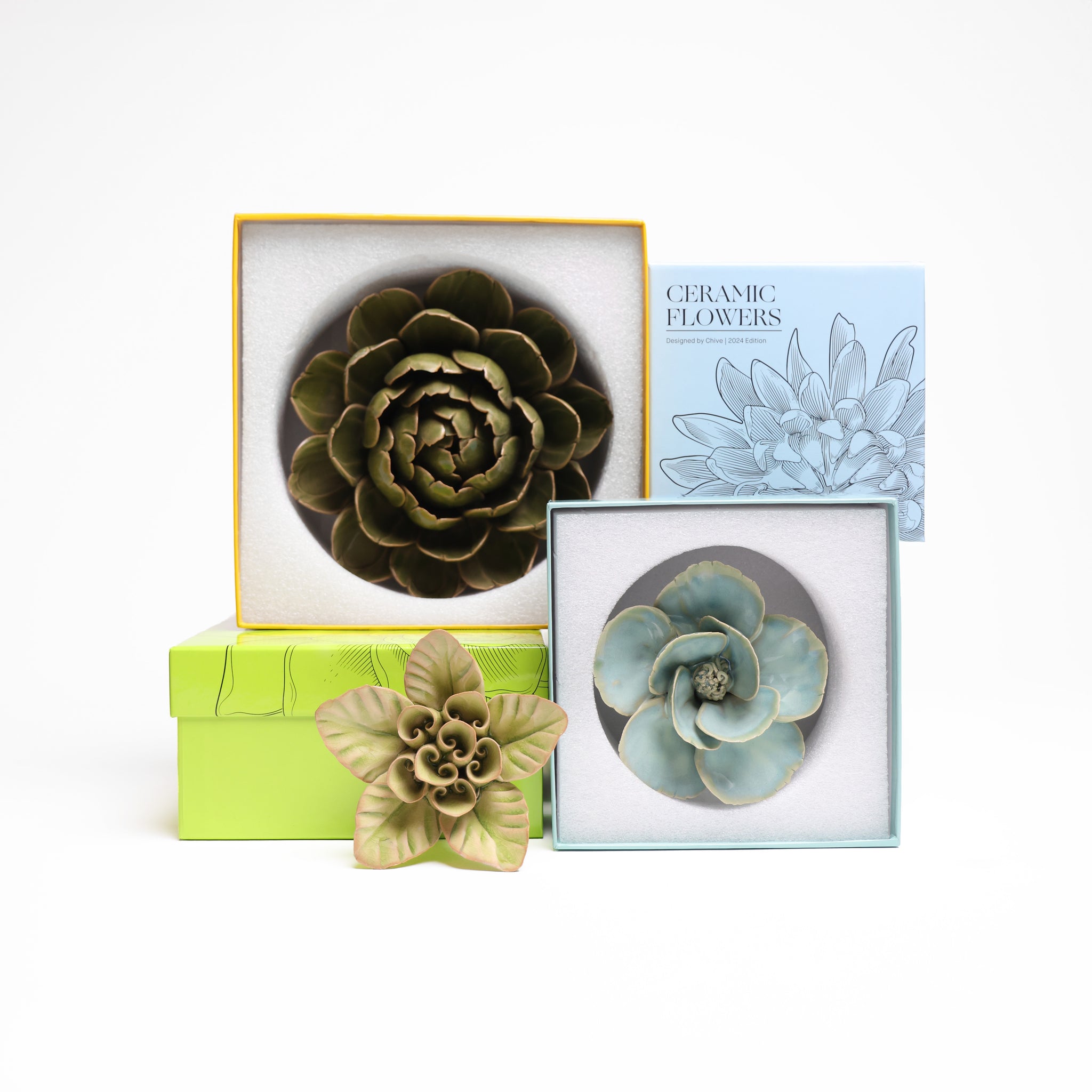 Our ceramic flowers come pre-boxed. Twelve different boxes, each one prettier than your actual wrapping job would've been. Finally, a gift that admits what we've all been thinking.